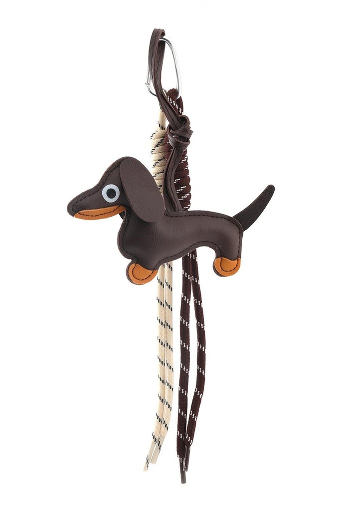 Koyu kahverengi köpek figürlü anahtarlık, bağlı dekoratif iplerle birlikte. Sevimli bir sosis köpek tasarımı ve kolay asma için halkası vardır.