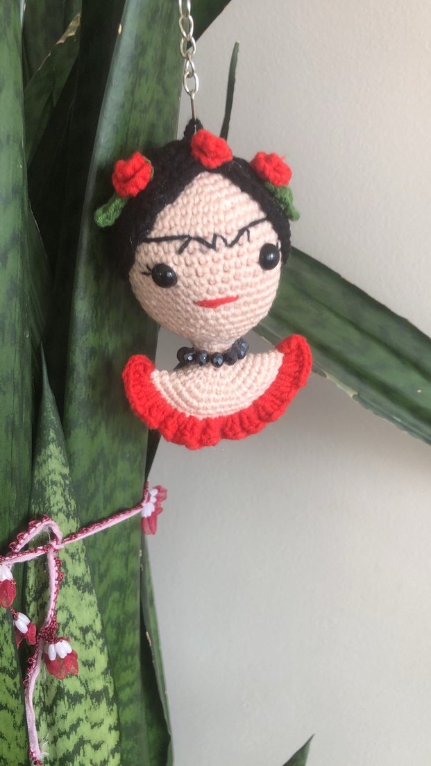 Çiçekli taç ve kırmızı fırfırlı yaka detaylı, yüz nakışlı renkli el yapımı örgü bebek anahtarlık.