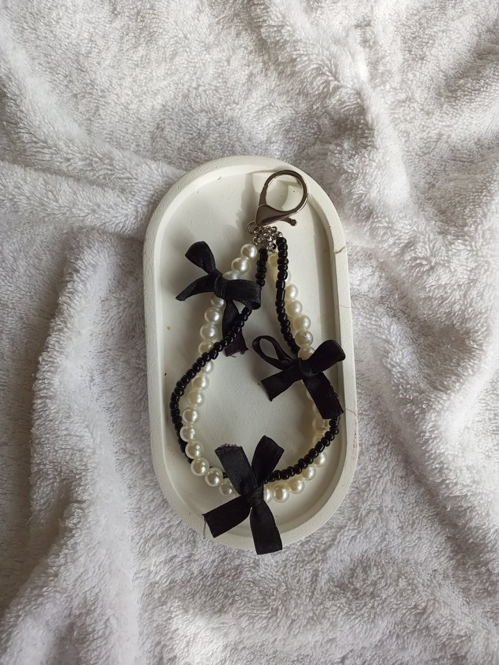Kadın anahtarlık, beyaz inci boncuklar ve siyah fiyonklarla gotik ve Paris esintili koyu şık bir görünüme sahiptir. ️sipariş üzerine yapılmaktadır.