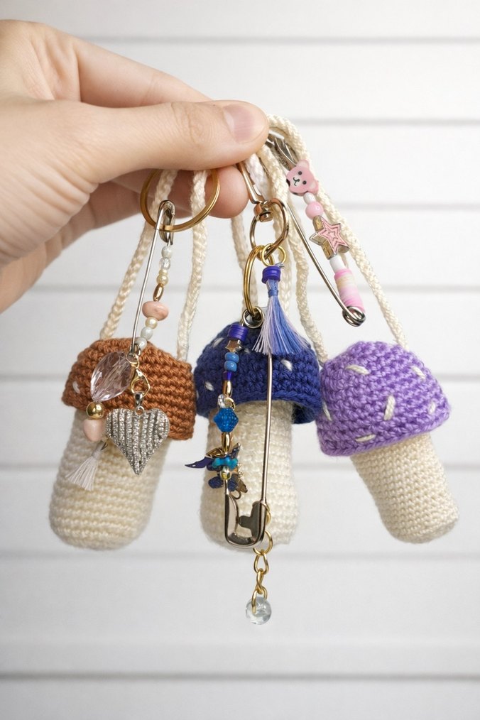 3’lü Set ✨ Set halinde alım daha avantajlıdır. Kargo satıcıya aittir. lipbalm ve ruj saklamak icin mantar kılıf ayni zamanda charm✅️ Tamamen el emeği ile örülmüştür Hafif ve çanta kullanımına uygundur Dayanıklı ip + metal halka Her biri tek ve özgün tasarımdır Çanta, anahtar, sırt çantası için şık aksesuar Sevdiklerinize hediye olarak da çok tercih edilir. Özenle paketlenerek gönderilir. Not: El yapımı olduğu için küçük farklılıklar olabilir, bu da ürünü özel kılar.
