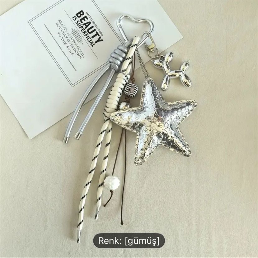 Gümüş renkli, yıldız figürlü, püsküller ve boncuklarla süslenmiş bohem tarzda kadın anahtarlığıdır. ✨
