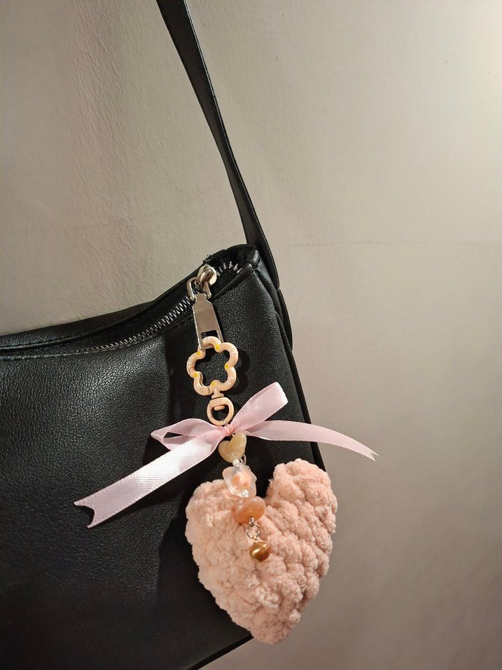 Püsküllü ve kalp şeklinde mor renkli, renkli kadın anahtarlık. Bohem ve rahat tarzda, çantanıza retro bir dokunuş katar.