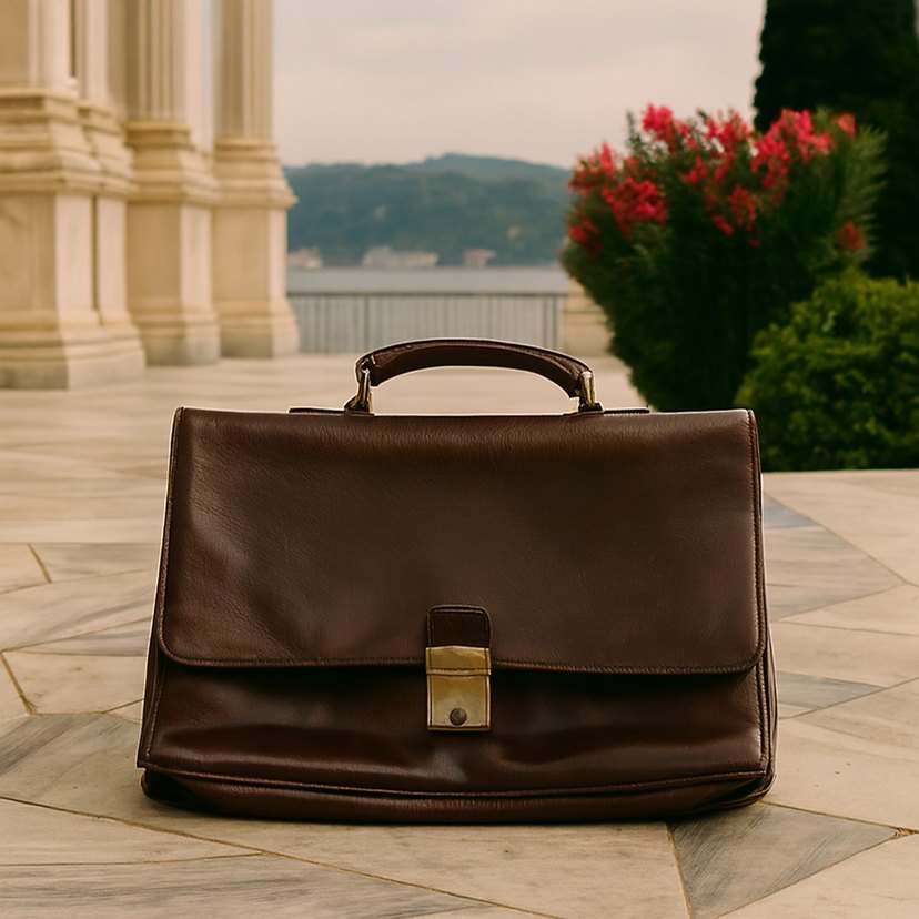 Toplam 6 gözden oluşan, 30 cm'e 40 cm ölçülerine sahip, hakiki deri evrak çantası.
