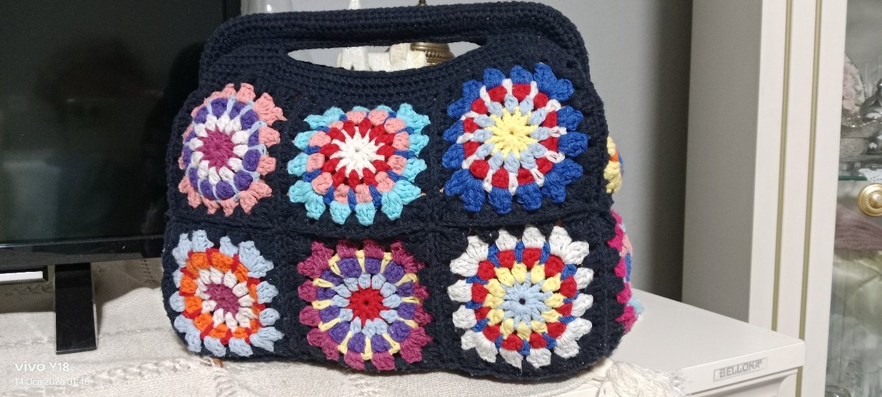 Kendi el emeğim.. Gizli burs kullanıldı 25 cm lik burs.. tamamı koton iple örüldü.. içi astarlı ve oldukça geniş.. eni 37 cm,boyu 24 cm.. 19 motiften oluşuyor..