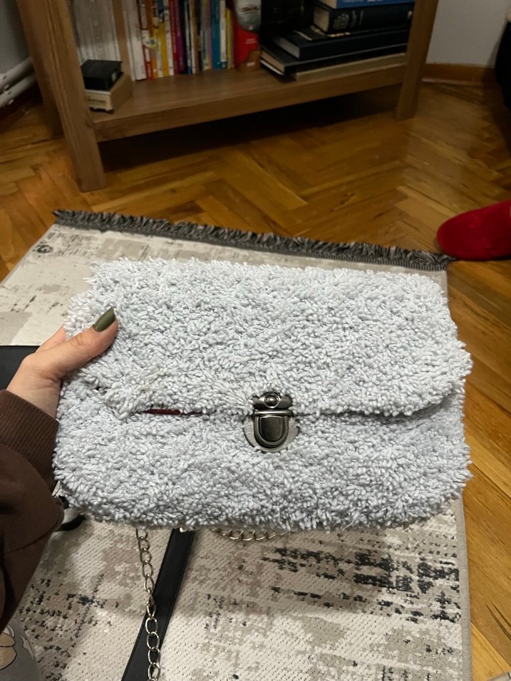 Bu gri kadın çanta, yumuşak peluş detaylara ve metal toka kapamaya sahip, rahat ve bohem bir stile sahiptir, günlük kullanım için uygundur.
