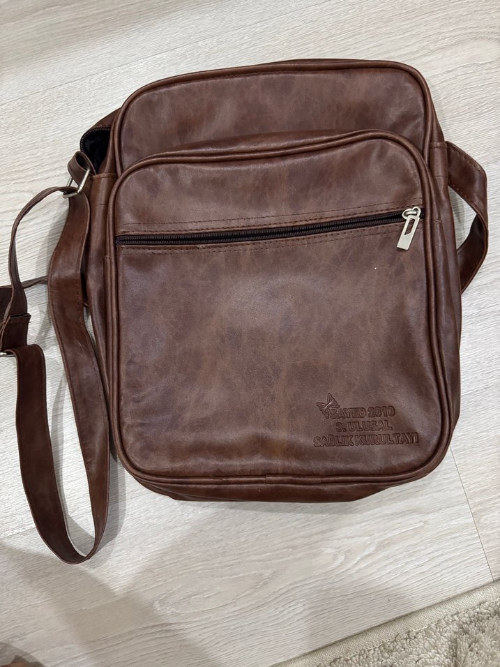 Üründe hasar yoktur. Parlak kahverengi omuz çantası, fermuarlı ön cep ve ayarlanabilir askıya sahiptir, klasik tarzı sokak modasıyla buluşturur.