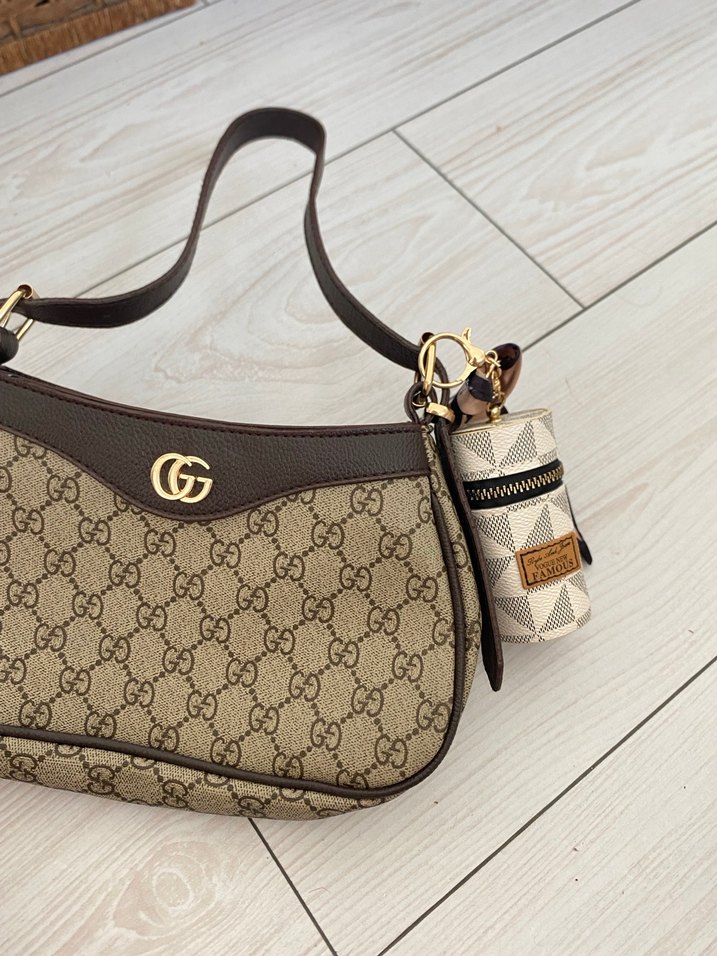 Kahverengi deri, yılan desenli, tokalı kadın omuz çantası. Gri aksesuar ve altın renkli 'G' logosu bulunur.