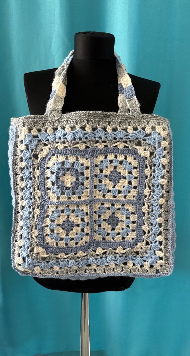 Mavi beyaz gri renkli ve desenli örgü el yapımı bohem tarzda kadın çantasıdır. Sıfır üründür Sipariş alınır