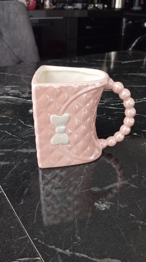 Pastel pembe seramik kupa, dokulu yüzey ve beyaz fiyonk detayı ile beaded kulp tasarımına sahiptir. ☕