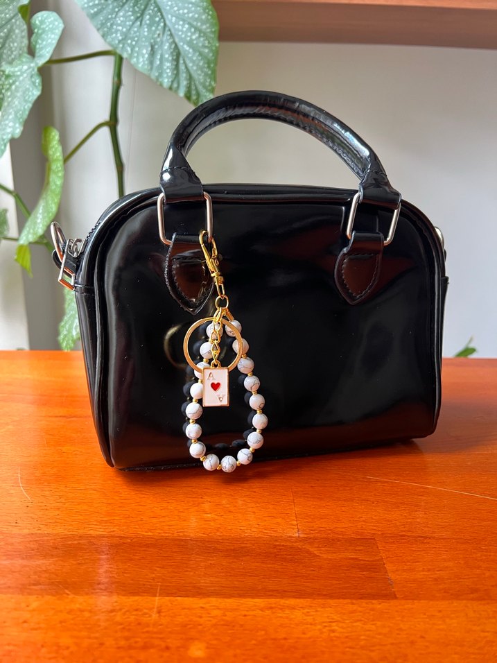 Parlak siyah deri malzemeden yapılan, baskılı desenli ve boncuklu aksesuarı olan kadın çantası, klasik ve goth tarzını birleştirir. Günlük kullanıma uygundur. Anahtarlık veya çanta süsü olarak kullanılabılır tekdir devamı yoktur kendim evde tasarlayıp yapıyorum