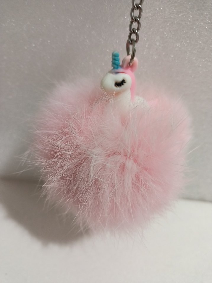 Pembe peluş ponpon üstünde plastik sevimli unicorn çanta süsü.