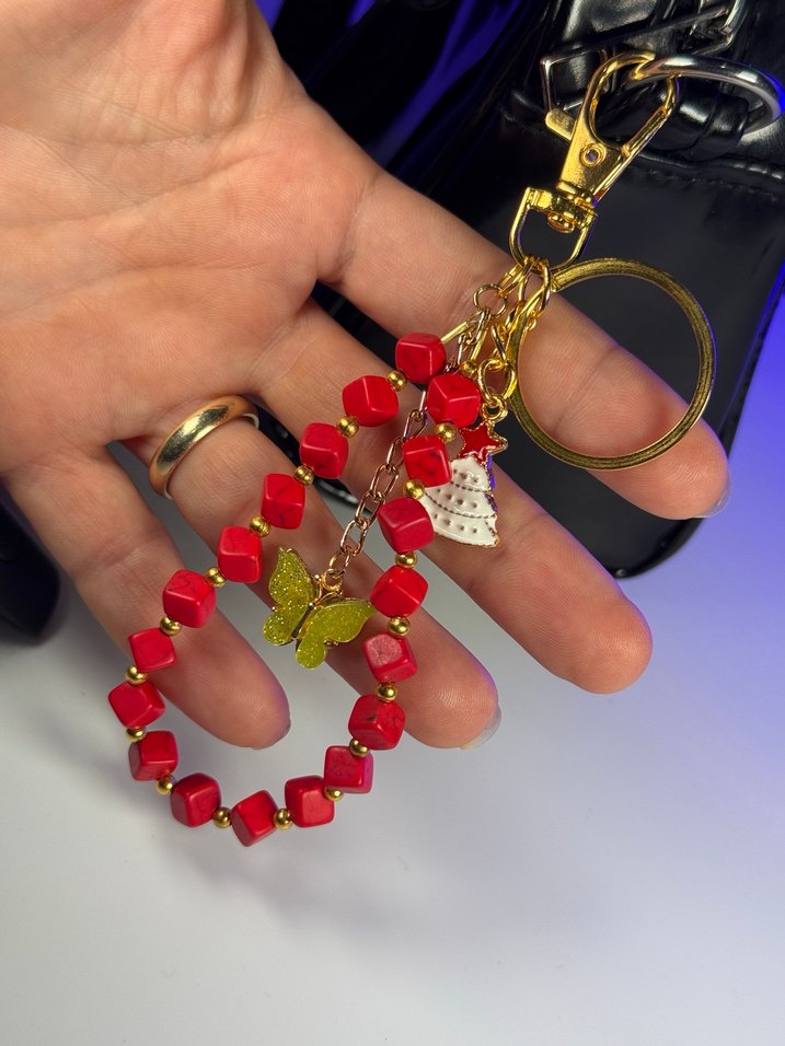 Canlı kırmızı boncuklar, altın kelebek ve küçük deniz kabuğu detaylarıyla bohem tarzda anahtarlık. Tasarı. Ürünüdür tek dir ister çanta süsü ister anahtarlık olarak kullanılabilir.