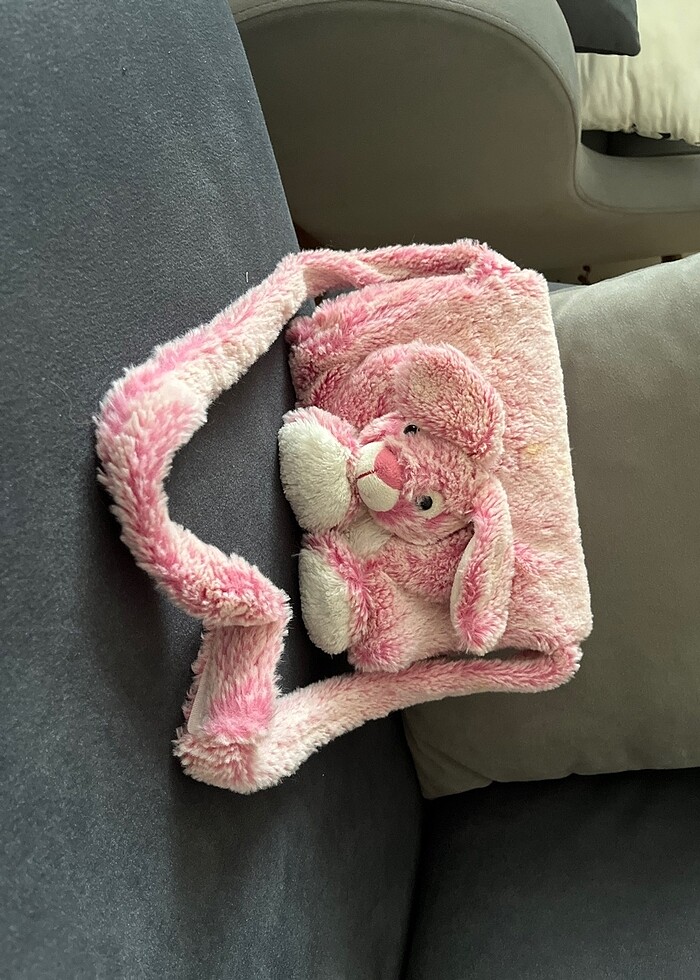 Soğuk havalarda çocuğunuzun elini içine geçirip ısınabileceği çanta şeklindeki tavşanlı kolluk. Fermuarlı kısmı cep göreci görmektedir.