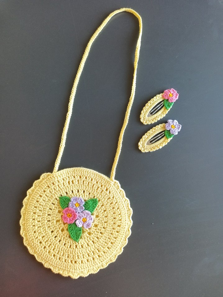 Sarı renkte, dantel dokulu yuvarlak bohem çanta, renkli çiçek desenleriyle süslenmiş ve uyumlu çiçekli saç tokalarıyla birlikte.