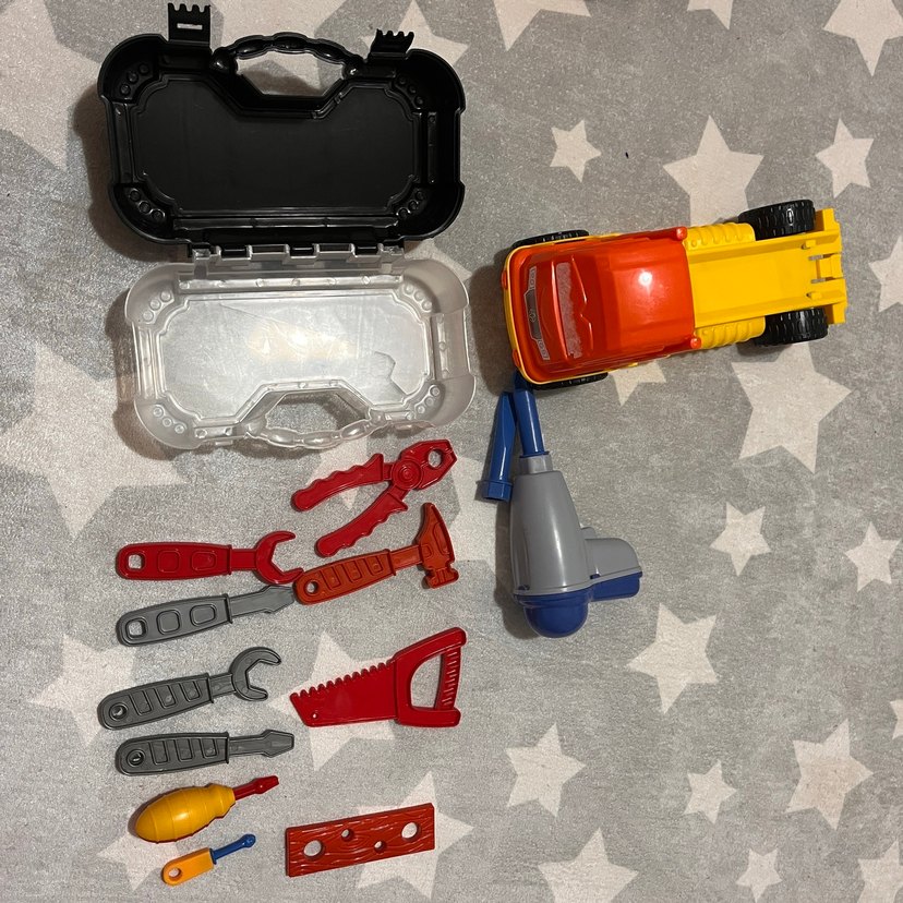 Bu eğitim oyuncak seti, çeşitli plastik aletler ve taşıma çantası içeren gri ve kırmızı renklerde hayal gücünü geliştiren tamir setidir.