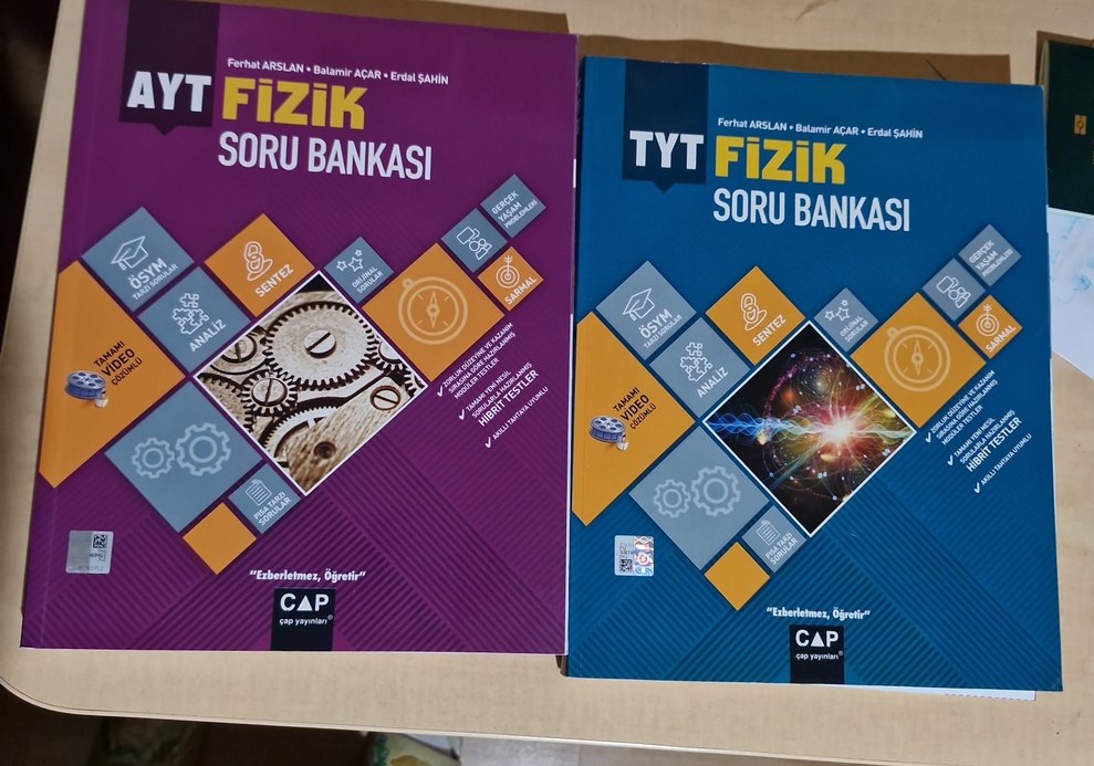 Çap yayınları orta-zor TYT-AYT fizik hibrit soru bankaları. Ayt tertemiz hiç çözülmemiş,tyt ise 2. resimde belirtildiği kadar çözülmüştür. Tekli satılır.