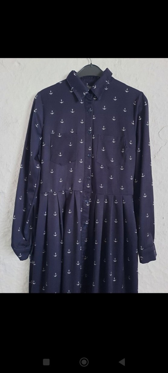 lacivert çapa desenli gömlek Elbise hafif tüylenme dışında hiçbir kusuru yok sadece birkaç kez kullanıldı beyaz çapa desenli, önü düğmeli, gömlek yaka, iki ön cep detaylı kemerli tam boy elbise hafif dökümlü kumaş günlük kumaş için ideal aler marka ölçüleri beden-40 boy-124cm en-42cm