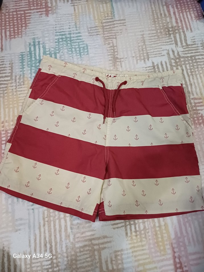 Çapa desenli, kırmızı ve bej renkli çizgili erkek deniz şortu. Xs bedendir.