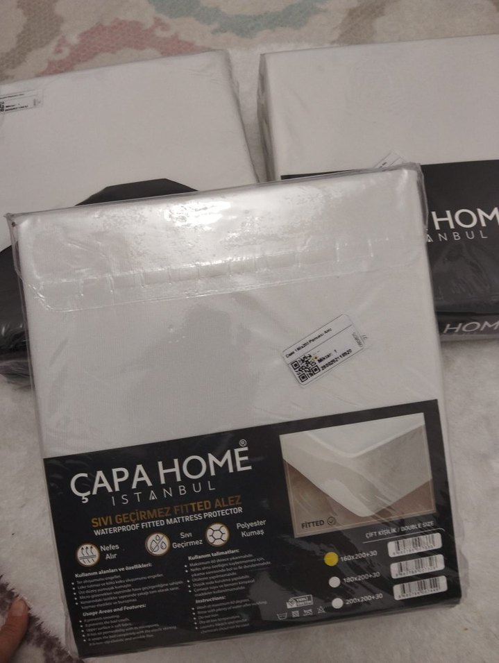 Çapa Home baskılı gri ve beyaz su geçirmez yatak koruyucu. Yumuşak polyester kumaştan, lastikli ve tam oturan model.