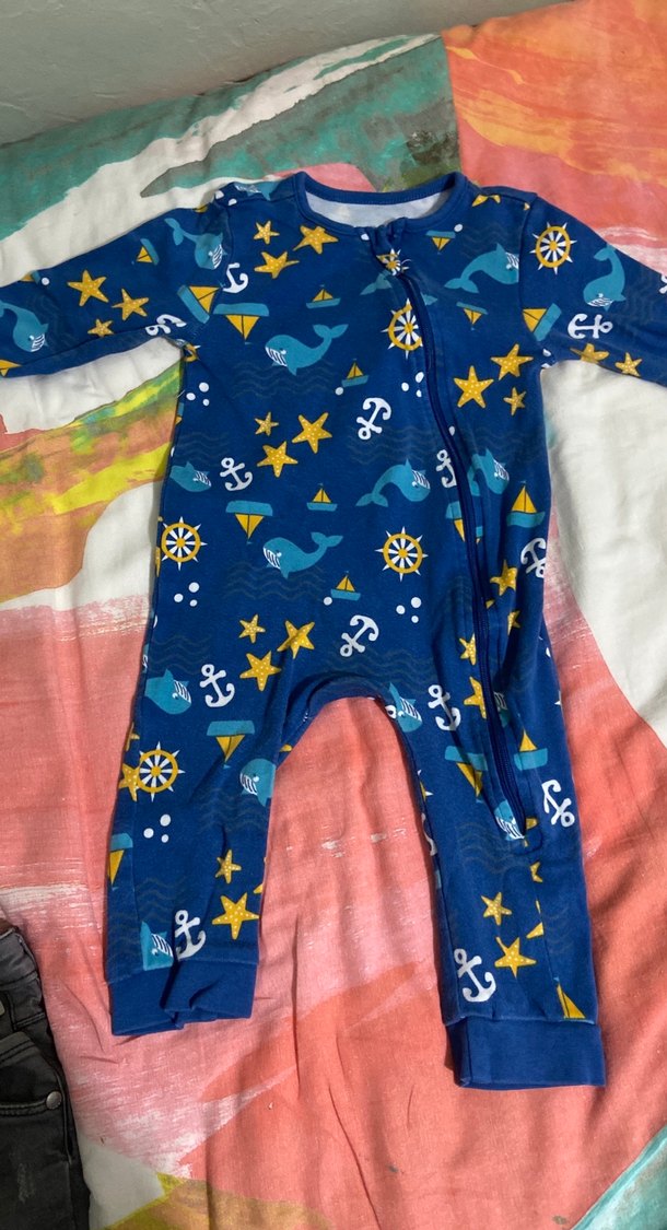 Uzun kollu ve yüksek yakalı, yumuşak ve sıcak kumaştan yapılmış fermuarlı bebek tulumu. Çapa, balina ve yıldız desenleriyle renkli deniz teması içerir.