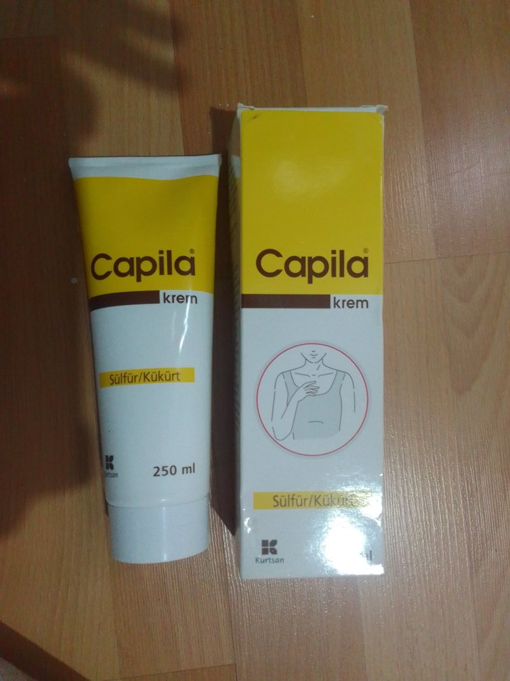 Kükürt içeren Capila krem, 250ml tüpte sunulur ve kaşıntı kremidir uyuz tedavisinde kullanılır. Basit ambalajlıdır.