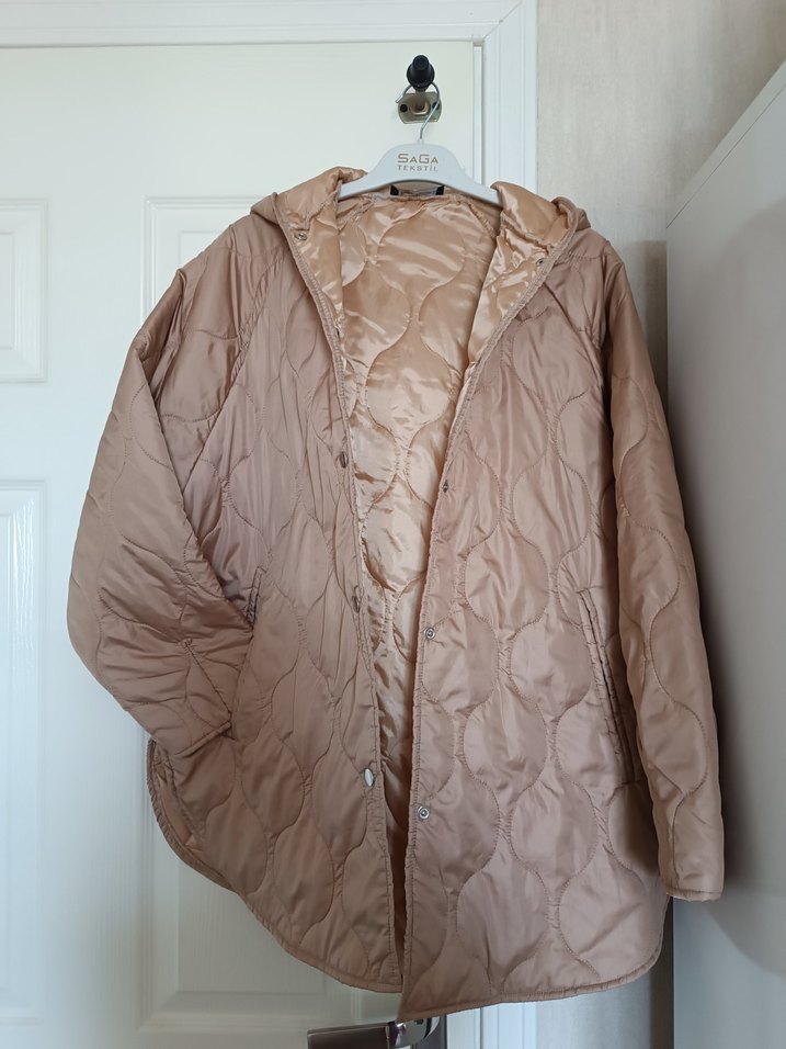 Bej midi uzunlukta, uzun kollu, düğmeli kadın kapitone mont Yumuşak keten kumaştan, rahat kesim ve çıtçıtlı, günlük kullanım için uygun. temiz bir kez kullanılmıştır.M giyen birinede olur