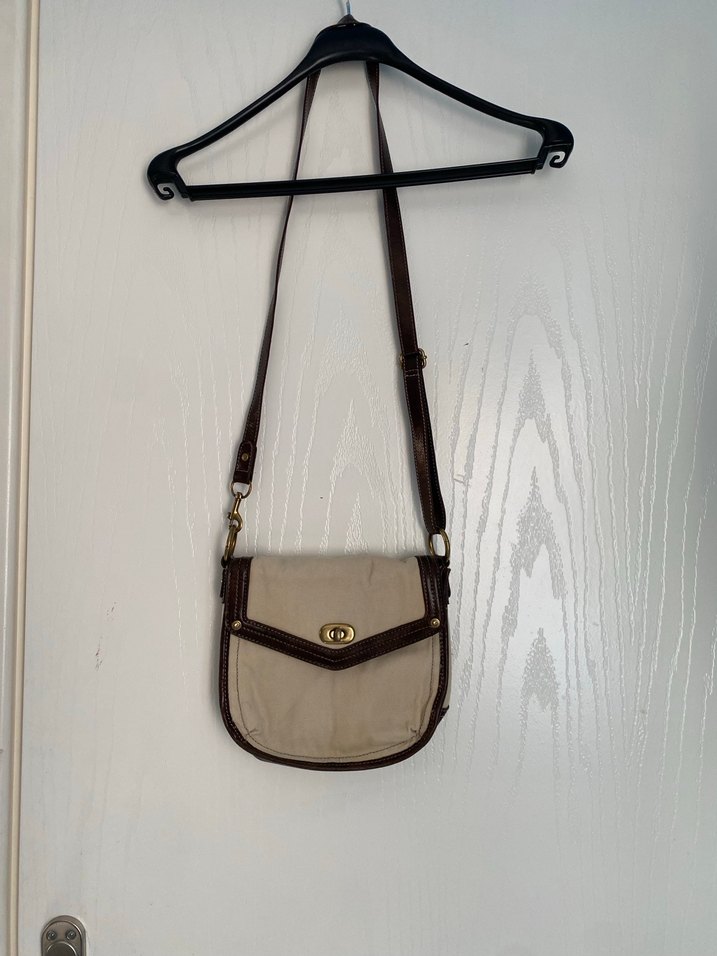 Bej deri tokalı kadın çantası, ayarlanabilir kayışlı ve desensiz tasarıma sahip, kullanıldı ama herhangi bi sorunu yok!