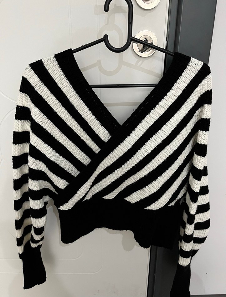 Çapraz Yaka Siyah Beyaz Çizgili Kadın Kazak