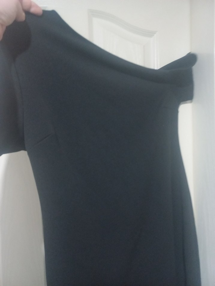 Bu siyah midi elbise, capraz yakalı ve kısa kollu, drapeli tasarımıyla minimalist gotik stile uygundur.
