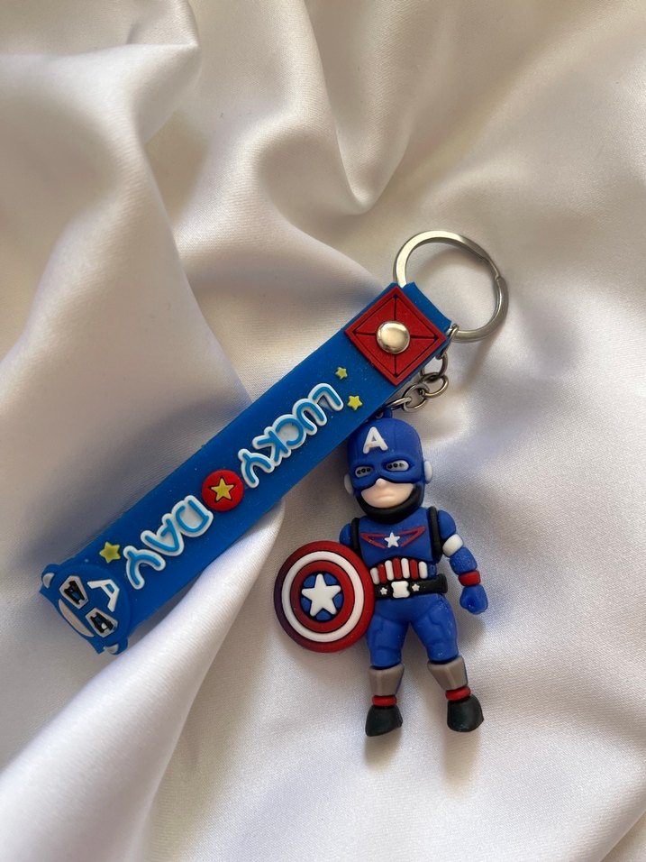Mavi renkli, velcro kapitoneli, Captain America figürlü pop kültür anahtarlığı, rock punk tarzına uygun.