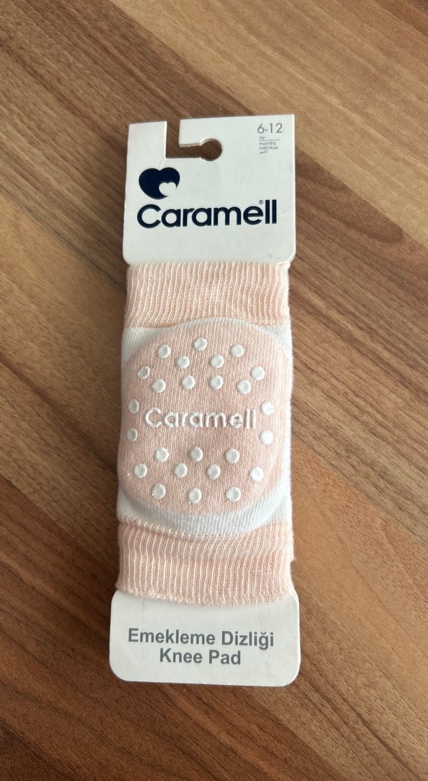 Caramell marka, 6-12 ay bebekler için pastel camel renkli, yumuşak örme kumaştan emekleme dizliği. Kaymaz desenli.