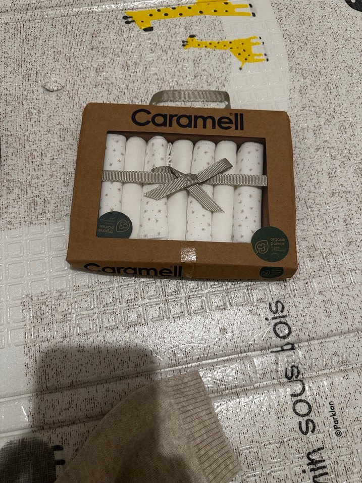 Caramell markalı, nakışlı pamuklu beyaz bebek mendil seti. Altı adet, sade ve rahat bohem tarzda mendil içerir.