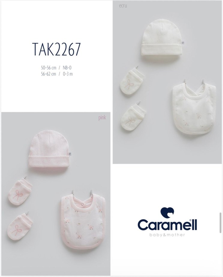 ®️ CARAMELL 0-3 AY ✅ 4 PARÇA SET Orijinal Kalıp Caramell markalı beyaz renkli, pastel nakışlı ve örgü bebek hastane seti. Şapka, eldiven ve önlükten oluşur, 0-3 ay (56-62 cm) beden için uygundur.