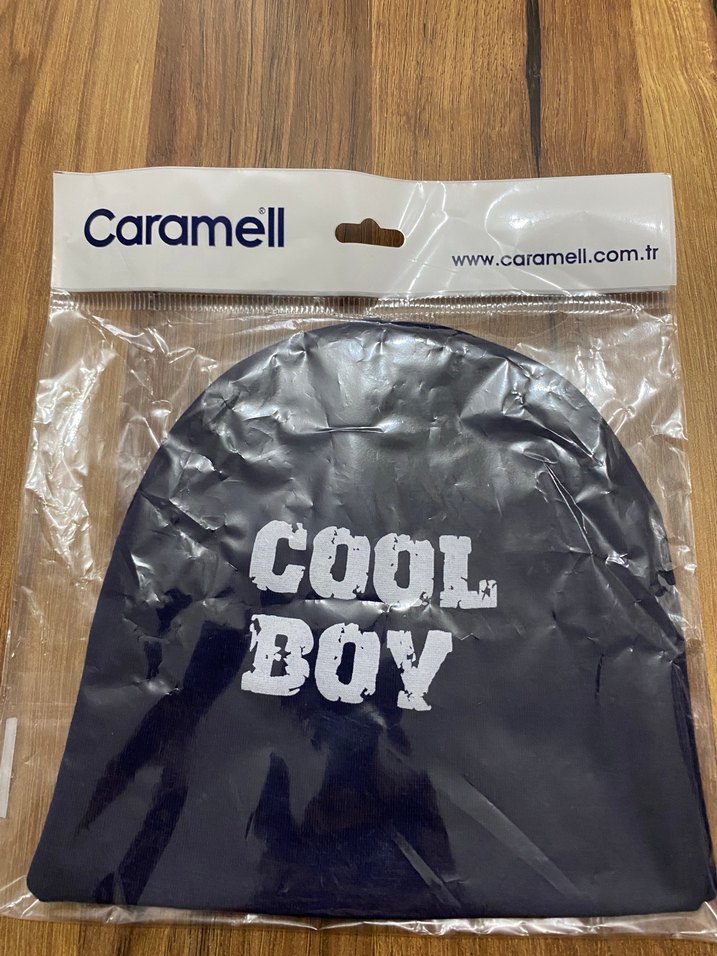 Caramell marka koyu camel renkli, "COOL BOY" baskılı ve püsküllü bere. Yumuşak plastik malzemeden üretilmiştir. Erkek çocuklar için rahat ve şık.