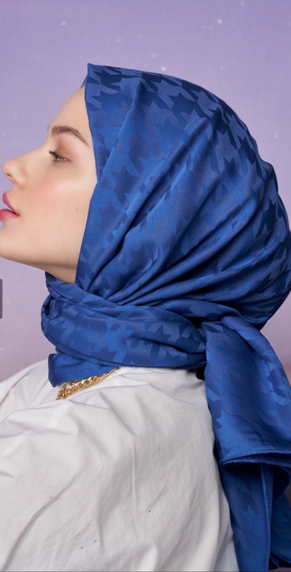 Parlak mavi renkte, saten dokulu ve drapeli kadın şal. Çağdaş ve gösterişli bir tarza sahiptir.