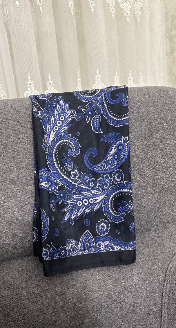 Koyu mavi tekstil üzerine dantel detaylı, bohem paisley desenli kadın şalı. Retro ve hippie tarzlarını yansıtır.