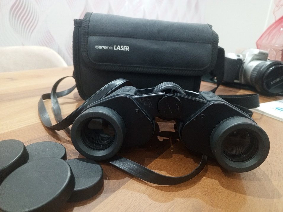 Ayarlanabilir odaklı siyah Carena Laser dürbün ve taşıma çantası. Kompakt ve dayanıklı, net görüş sağlar.