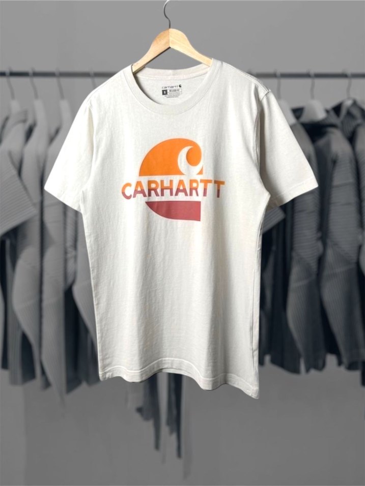 Carhartt baskılı, pamuklu, beyaz oversize tişört. Kısa kollu, yuvarlak yaka ve normal boyda, rahat kesim sokak stili için uygun.