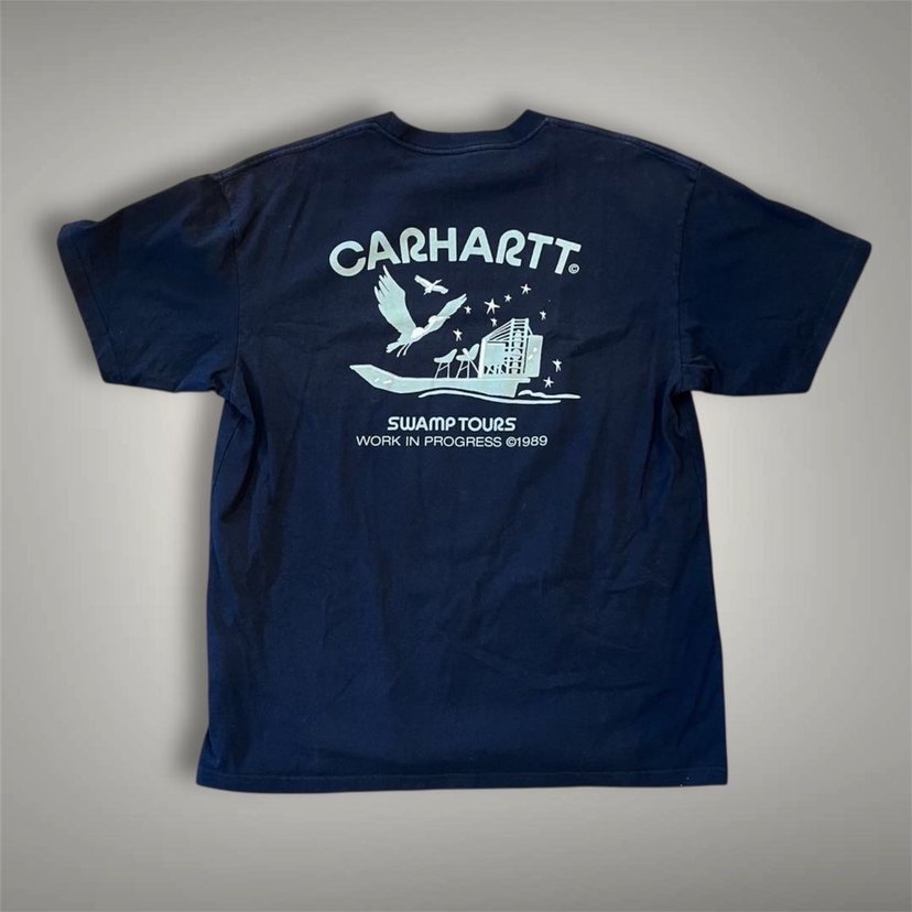 Carhartt marka, pamuk kumaştan yapılmış, rahat kesim, kısa kollu ve bisiklet yaka erkek tişörtü. Lacivert renginde, sırtında baskılı desen bulunur, sokak stili için uygundur. Göğüs 56 cm