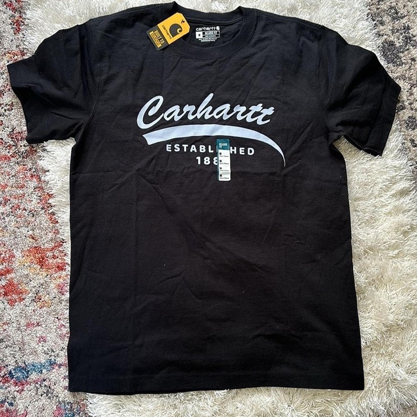 Siyah Carhartt erkek tişörtü, bisiklet yaka ve kısa kolludur. Baskılı logo ve pamuklu kumaşla rahat, normal uzunlukta, günlük kullanıma uygun.