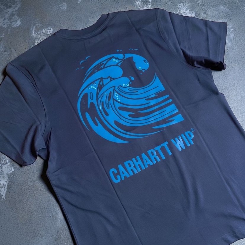 Göğüs 56 cm.Carhartt WIP marka, baskılı dalga deseni ve logo detaylı, koyu mavi renk, kısa kollu, yuvarlak yaka, sentetik kumaş, rahat kesim erkek tişörtü.