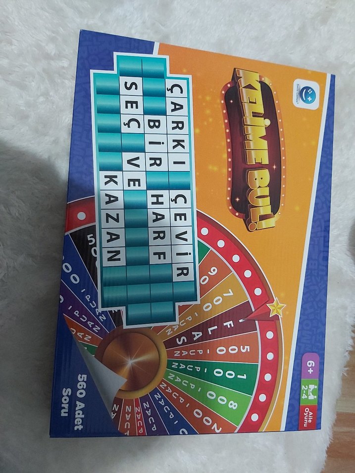 Çarkı çevir ve kelime bulma temalı, 560 soru kartı içeren çok renkli bir masa oyunu. 6 yaş ve üzeri için uygundur. Daha önce oynamadık resimde belirttiğim yerde ufak bi çatlak var oda yapıştırılabilir oyuna engel değil doğum gününde hediye gelmişti çok fazla oyun olduğu için satmak istiyorun