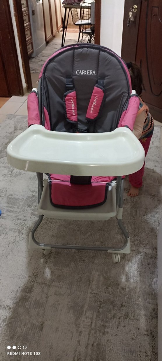 Carlera marka pembe ve gri renkli bebek mama sandalyesi, çıkarılabilir beyaz tepsi ve yumuşak kayışlara sahiptir. Hareket kolaylığı için tekerlekli. ️ Şentepe Ankara yakını