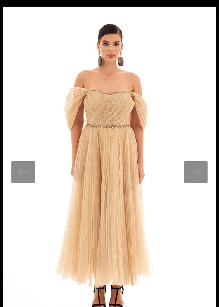 Carmen Gold Düşük Kol Taşlı Tül Nişanlık