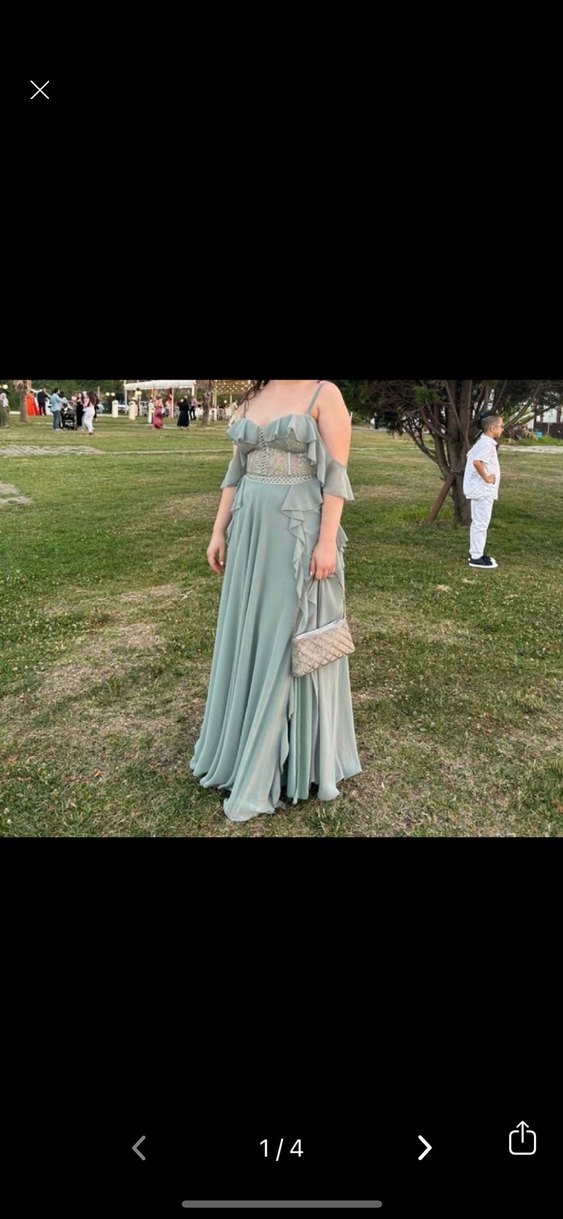 Bir kaç saat giydim,boyu kesildi 160 boy 10 cm topuklu ile giydim. 38-40 bedene uyumludur. CARMEN MARKADIR. Rengi çağla yeşilidir.