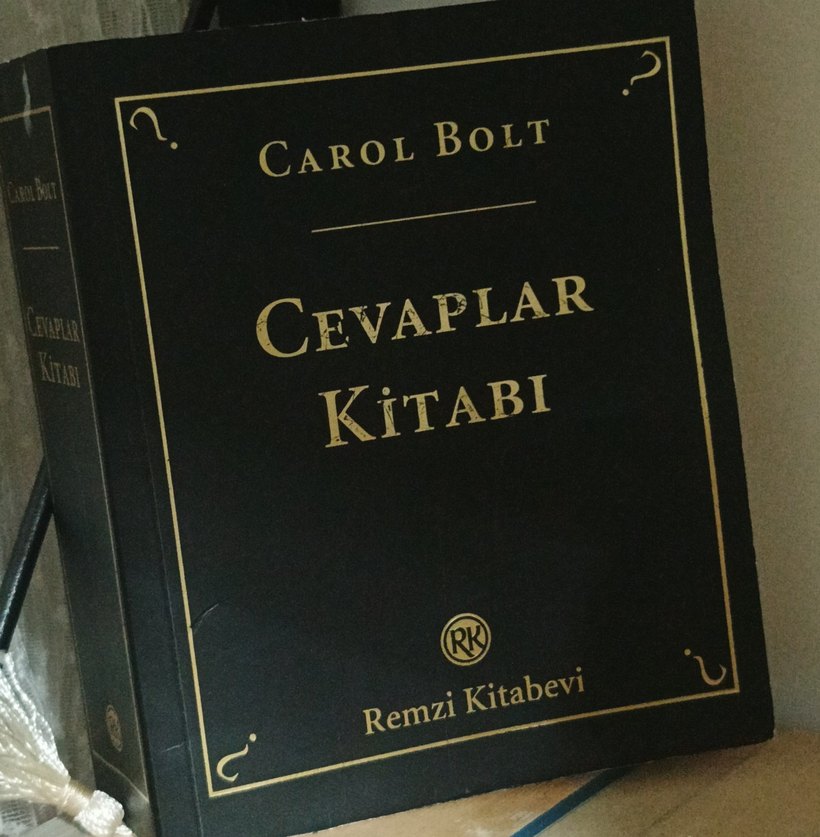 Carol Bolt'un "Cevaplar Kitabı" adlı romanı, Remzi Kitabevi tarafından yayımlanmış, siyah kapak üzerine altın yazılıdır.