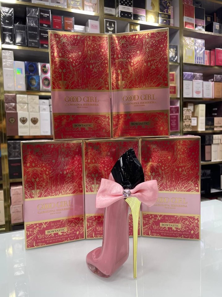 Carolina Herrera Good Girl kadın parfümü, pembe fiyonk detaylı yüksek topuk şekilli şişesiyle dikkat çekiyor. Kırmızı ve altın renkli şık kutuda sunuluyor.