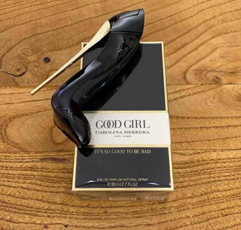 Carolina Herrera Good Girl kadın parfümü, yüksek topuk şeklinde şık şişede 80 ml eau de parfum doğal sprey olarak sunuluyor. "Kötü olmak çok iyi" sloganı bulunur.