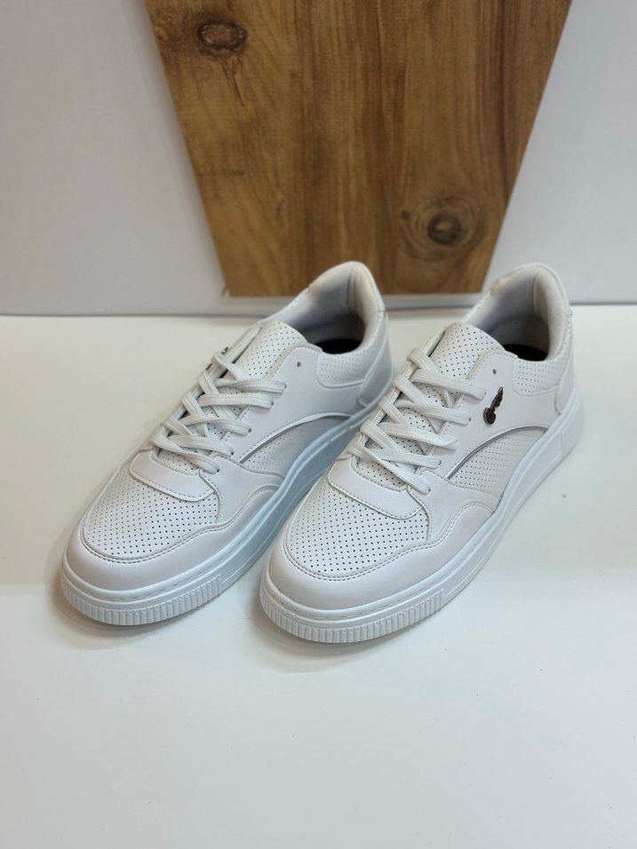 Beyaz, delikli tasarımlı, stiletto topuklu kadın spor ayakkabısı. Kauçuk tabanlı, minimalist ve şık görünümüyle gündelik kullanıma uygundur.