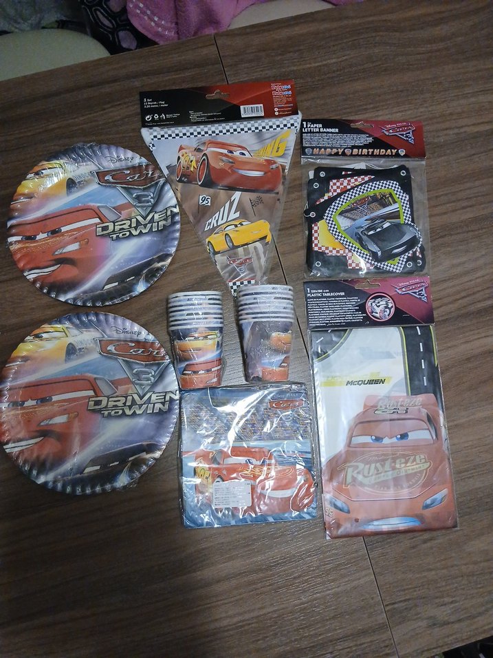 Arabalar temalı tabak, bardak, peçete ve afişlerden oluşan çok renkli parti malzemeleri. ürünler sıfır olup orijinal ambalajındadır